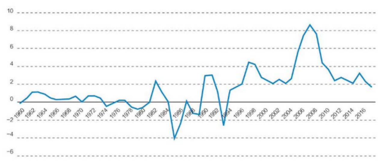 图5 中国1960—2017年商品及服务净出口占国内生产总值的百分比