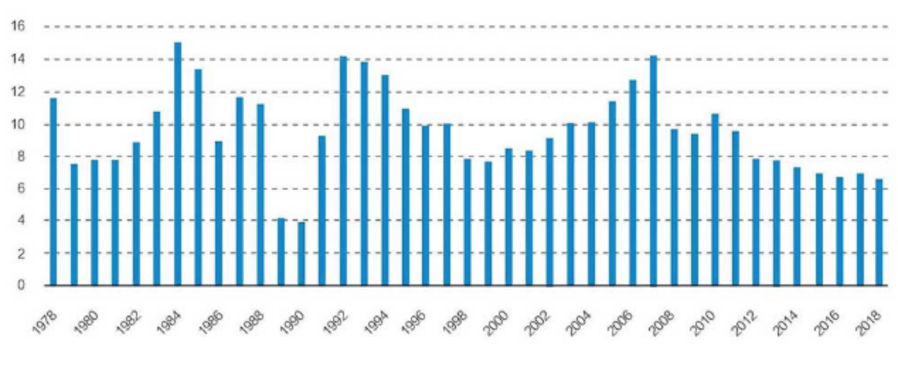 图4 中国1978年到2018年通货膨胀调整后的实际经济增长率